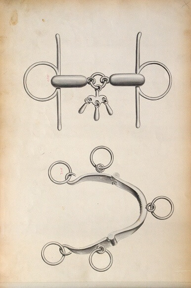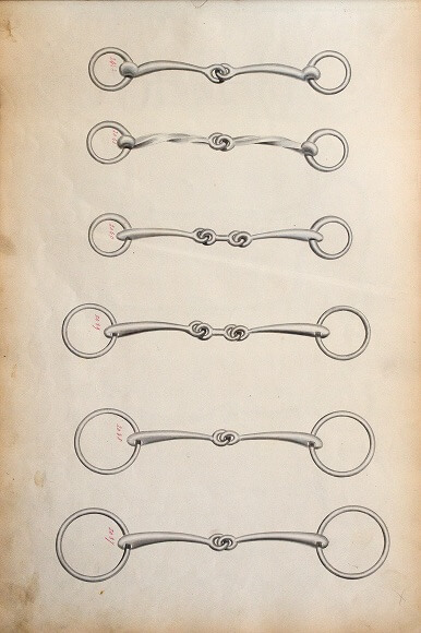 この2枚のドローイングは、銜(クツワ)のオーダーカタログの一部です。左に描かれているのは、馬の口に装着される遊具付き馬銜(ハミ)。右は水勒銜(スイロクハミ)と呼ばれるもっともオーソドックスなクツワです。これらは、それぞれの形状を精細にスケッチしたもので、精密かつ機能的なドローイングだといえます。