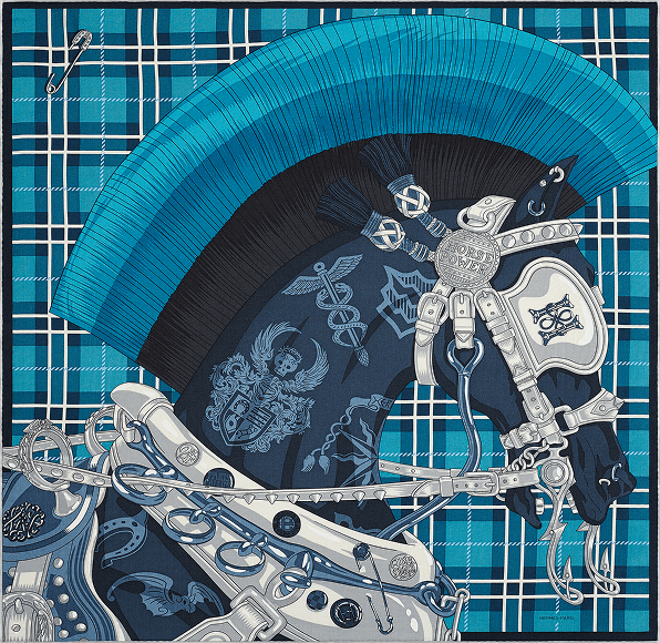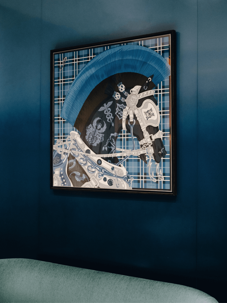 野村大輔による《シュヴァル・パンク》は、2021年にカレのために描き下ろされたドローイングです。エミール・エルメス・コレクションが並ぶパリのミュゼで、太いたてがみを持つ馬の頭の形をしたペン先のクリーナーを見つけた野村は、そこからパンクを連想し、そのほか数多くの馬具を絵の中に盛り込み、パンクとメゾンの世界観を見事に融合させたデザインを描きあげました。