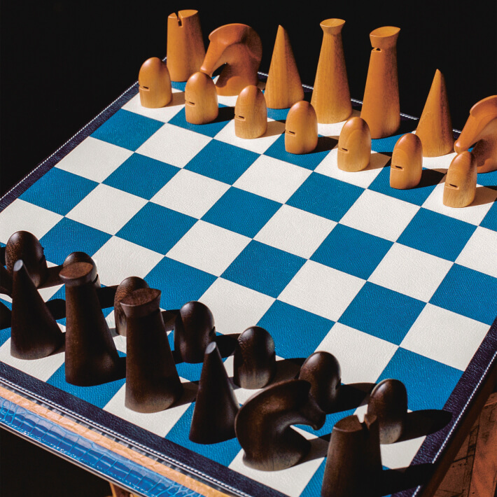 すべての駒は、マホガニーとカシアウッドの無垢材から切り出され、職人の手によって彫り上げられたのちに丁寧に磨かれます。プレイ中の動きをスムーズにするのは、駒の中に組み込まれたステンレス製のウェイトです。エルメスを象徴する《クルー・ド・セル》のロゴが裏面に刻印されています。ヴォー・エプソムをレザーマルケトリの技法で組み立てた64マスのチェスボードは、熟練の職人により均一で滑らかな表面を作り出しています。
