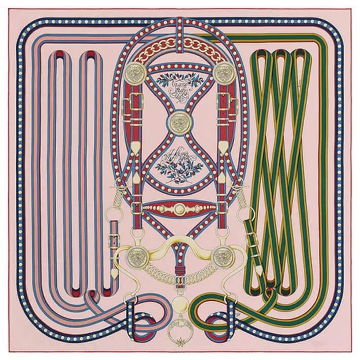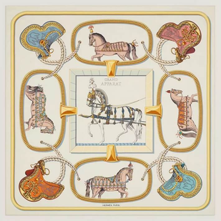 今日、馬具用品のすべてはお店では手に入りませんが、そのドローイングは創作の源であり、絶えず再解釈されています。2021年には、儀式用馬具から発想を得た《グラン・トゥラララ》、1962年に発表され「永遠のスカーフ」と呼ばれる《グラン・アパラ》は、近年には当時の配色を活かしたデザインで再現されました。