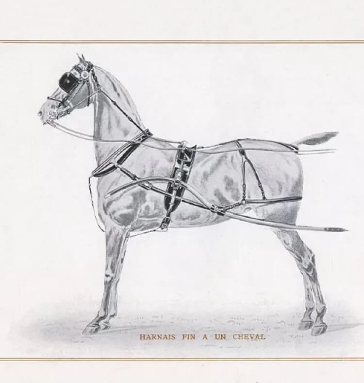 19世紀になると、より軽やかで快適な馬車が求められます。それは馬との新しい関係が生まれた時代でもありました。エルメスの馬具職人の卓抜した技により、車体をひく小さな馬、あるいは大きなポニーがサラブレッドさながらに馬車をひきます。尻繋(しりがい)は尾の風格を高め、頸環(くびわ)に通された手綱は馬の首筋をすっと伸ばします。馬そのものの美しさを引き立てるフルオーダーの馬具は、機能性とデザイン性が融合した、時代を先取りしたオブジェであったといえるでしょう。