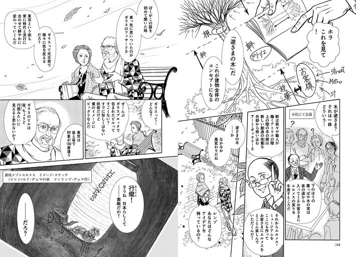 エルメスのものづくりに関わる方は皆さん、それぞれの仕事を通じて「見えないものを見えるようにする」ことを実行していらっしゃると思います。マンガ『エルメスの道』を読んでいただければおわかりになると思いますが、エルメスは創業時から他社とはちょっと違うオリジナルな考え方で、さまざまなオブジェを創り出してきました。実際に描いたり言葉を綴ったりすることだけが「ドローイング」ではないのです。まだ見えない空気の中に浮かぶ新たな何かを、その手、その思いで形にすること。それがすべて「ドローイング」なのだと思います。そのようなオリジナリティがエルメスにはずっと根付いているのですね。