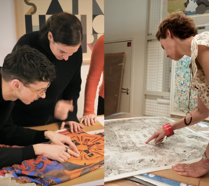 ステュディオ・デッサンは、パリでエルメスのグラフィック・クリエーションを担う部門です。世界各地のクリエイターたちから届いた作品をもとに、彼らとの対話を重ねることで、エルメスのオブジェに用いられるデザインを生み出します。私たちのチームにはグラフィックデザイナーやアートディレクターといった専門家がいて、ひとつひとつの作品をオブジェに落とし込むための、自在な再解釈を行っているのです。また、1937年から蓄積してきた約8,000点にも及ぶデザインを保存、修復したアーカイブも管理しています。これらをチームのメンバーが再び目にすることで、新たなインスピレーションを得ているのです。