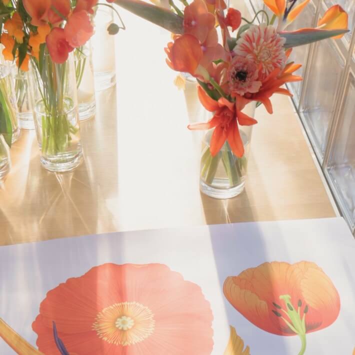 カレ《ブケ・フィナル》の誕生には、ちょっとしたエピソードがあります。イギリス人イラストレイター、ケイティー・スコットが友人である日本のフラワーアーティスト、東信さんと対談を行いました。東さんは、2024年に銀座メゾンエルメスをパリの街角のお花屋さんにしたときに小さなブーケを用意したのですが、ケイティーはそのブーケの作品に呼応する大きな花束を描いたのです。そのデザインを見た瞬間に私たちは感激し、カレ《ブケ・フィナル》の誕生へと繋がりました。