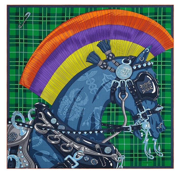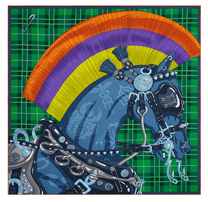 エルメスにおける僕のデザインは、ほとんどと言っていいくらいパリのフォーブル・サントノーレ店にあるエミール・エルメス・コレクションが並ぶミュゼ(美術館)にあるアイテムをもとに制作しています。昔は万年筆にインクをつけて手紙を書いたと思うのですが、そのペン先を掃除するブラシに馬の形のものがありました。たてがみの部分がブラシになっているのですが、それがモヒカンに見えるので、「パンクの馬なんてどう?」と提案したのが《シュヴァル・パンク》のはじまりです。クリストフは音楽にも精通していてパンクカルチャーにも詳しく、だったら「背景はタータンチェックにしてみない?」とアイデアをもらったりしながら、一緒につくりあげました。