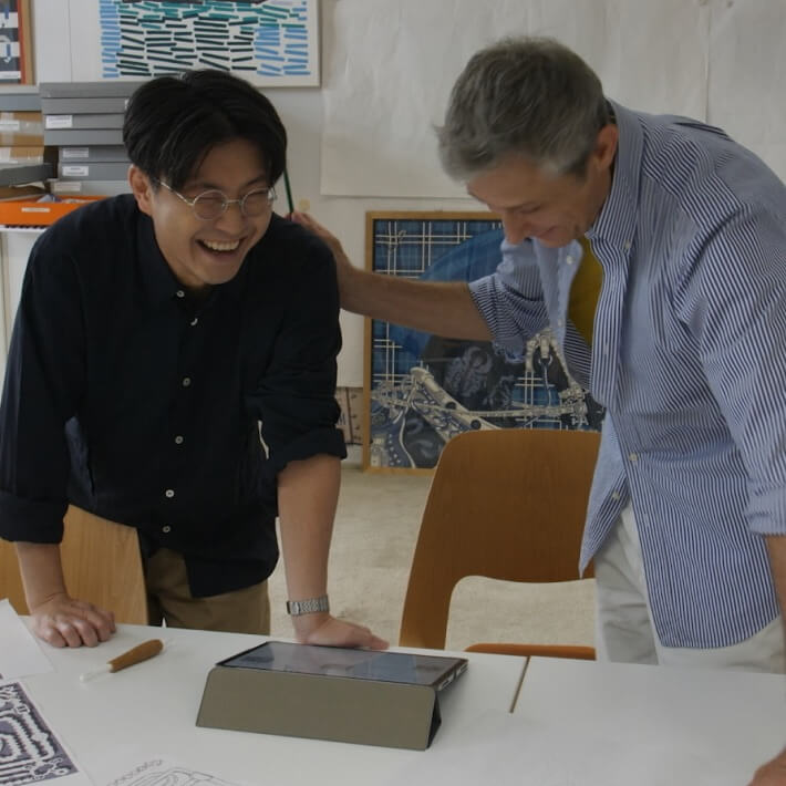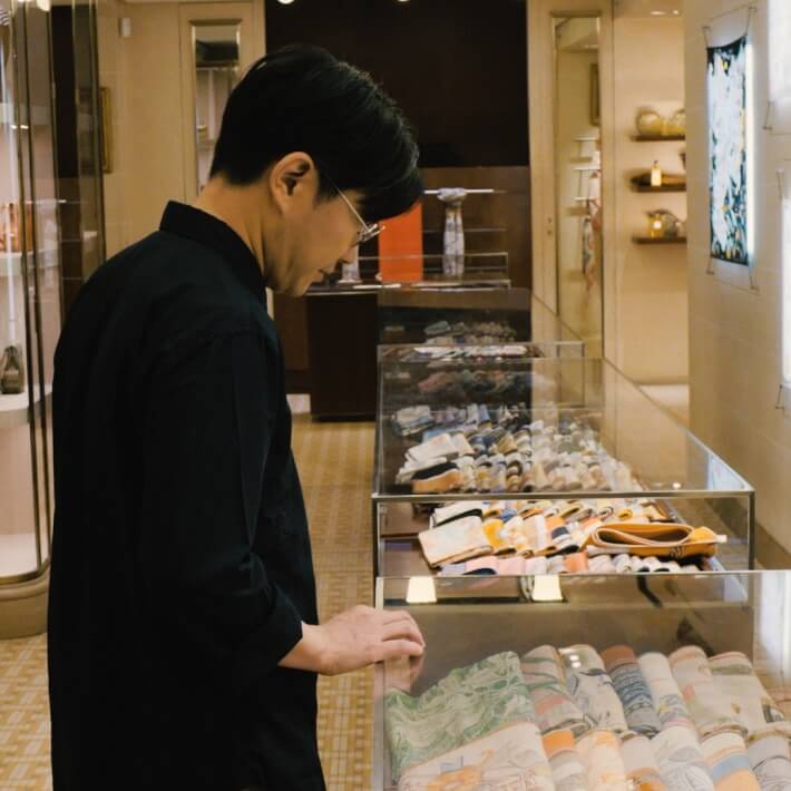 エルメスでは主にカレのデザインのための原画を描いています。エルメスとは、2009年にネクタイのコンペに応募し、特別賞を受賞したのがきっかけで、仕事をさせてもらうようになりました。メンズシルクのディレクターであるクリストフ・ゴワノーが、コンペでの受賞作品をもとに「一緒にスカーフをつくってみないか?」と誘ってくれたんです。その頃の僕はテキスタイルデザイナーとして活動している頃でしたね。しばらくはメンズのスカーフを描いていましたが、2022年頃からはウィメンズも手掛けるようになりました。